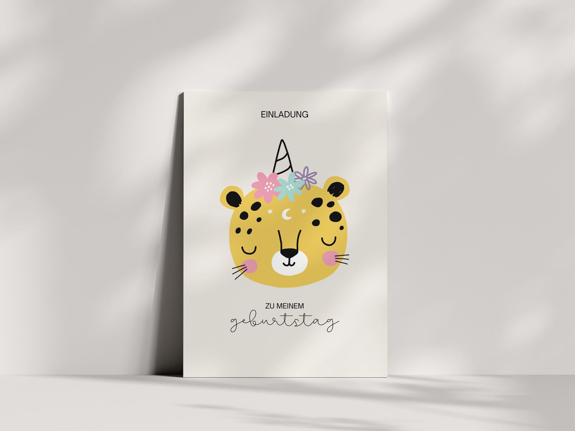 Bunte Karten für Kindergeburtstage mit liebevoller Party-Leopard-Illustration 🐆🎊