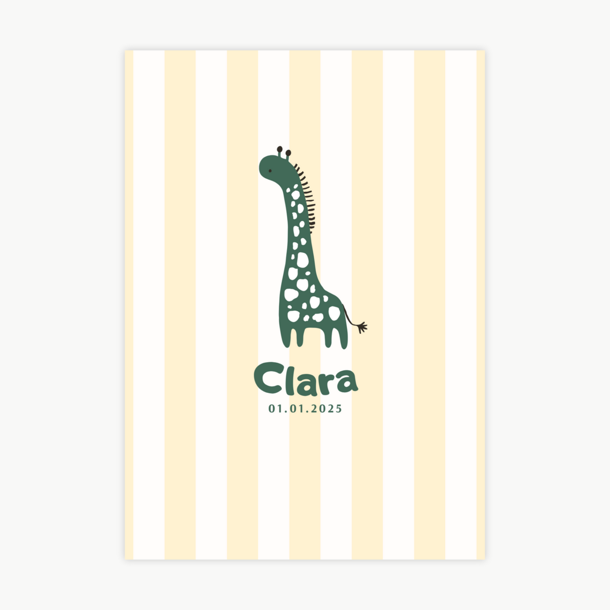 Unsere bunten Kinderposter werden mit viel Liebe gestaltet und können ganz einfach mit dem Namen deines Kindes personalisiert werden – auf Wunsch auch mit Geburtsdatum oder einem kleinen Extra-Detail. Das wunderschöne Giraffen-Motiv, bringen Wärme und Freude ins Kinderzimmer und schaffen eine besondere Wohlfühlatmosphäre.