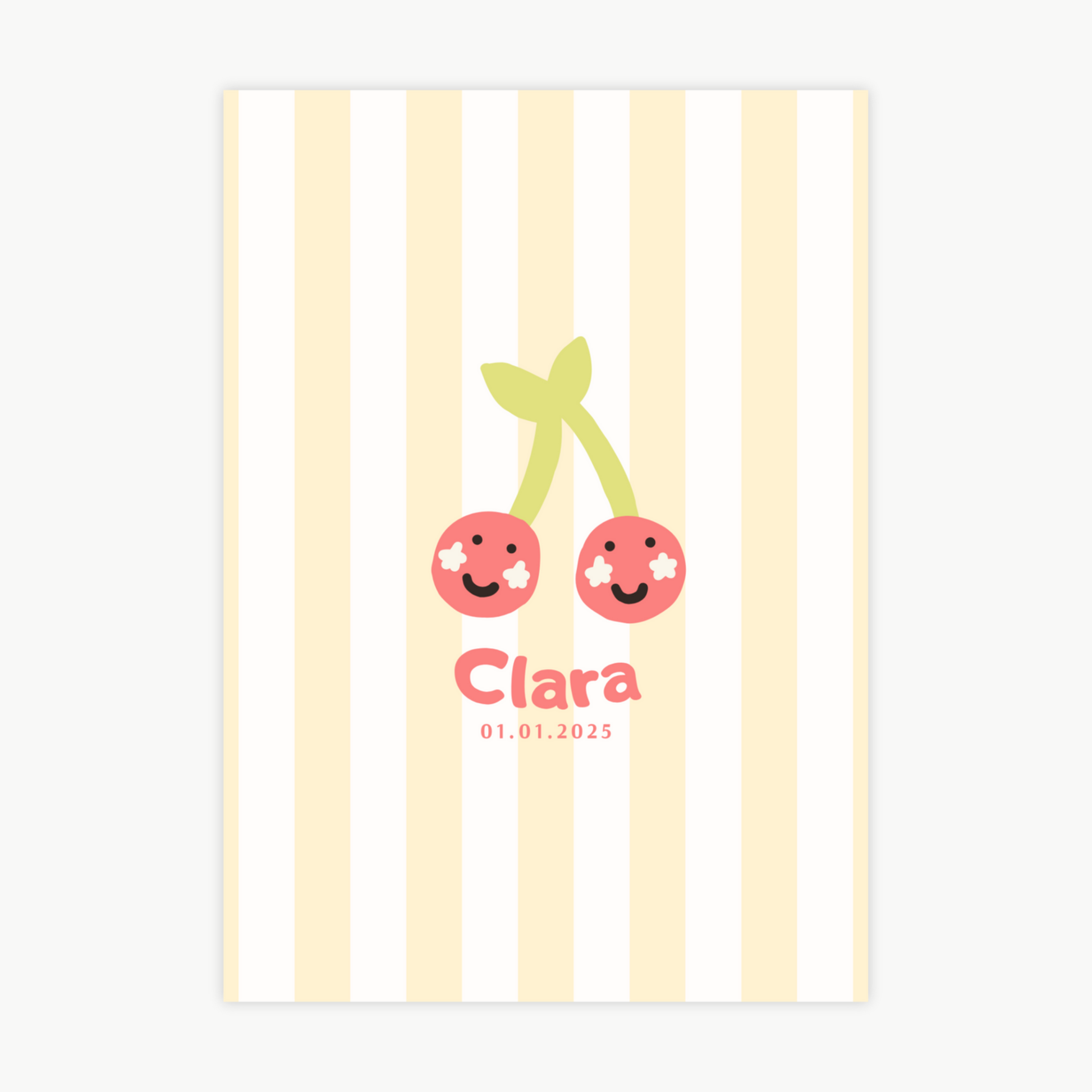Unsere bunten Kinderposter werden mit viel Liebe gestaltet und können ganz einfach mit dem Namen deines Kindes personalisiert werden – auf Wunsch auch mit Geburtsdatum oder einem kleinen Extra-Detail. Das wunderschöne Kirschen-Motiv, bringen Wärme und Freude ins Kinderzimmer und schaffen eine besondere Wohlfühlatmosphäre.