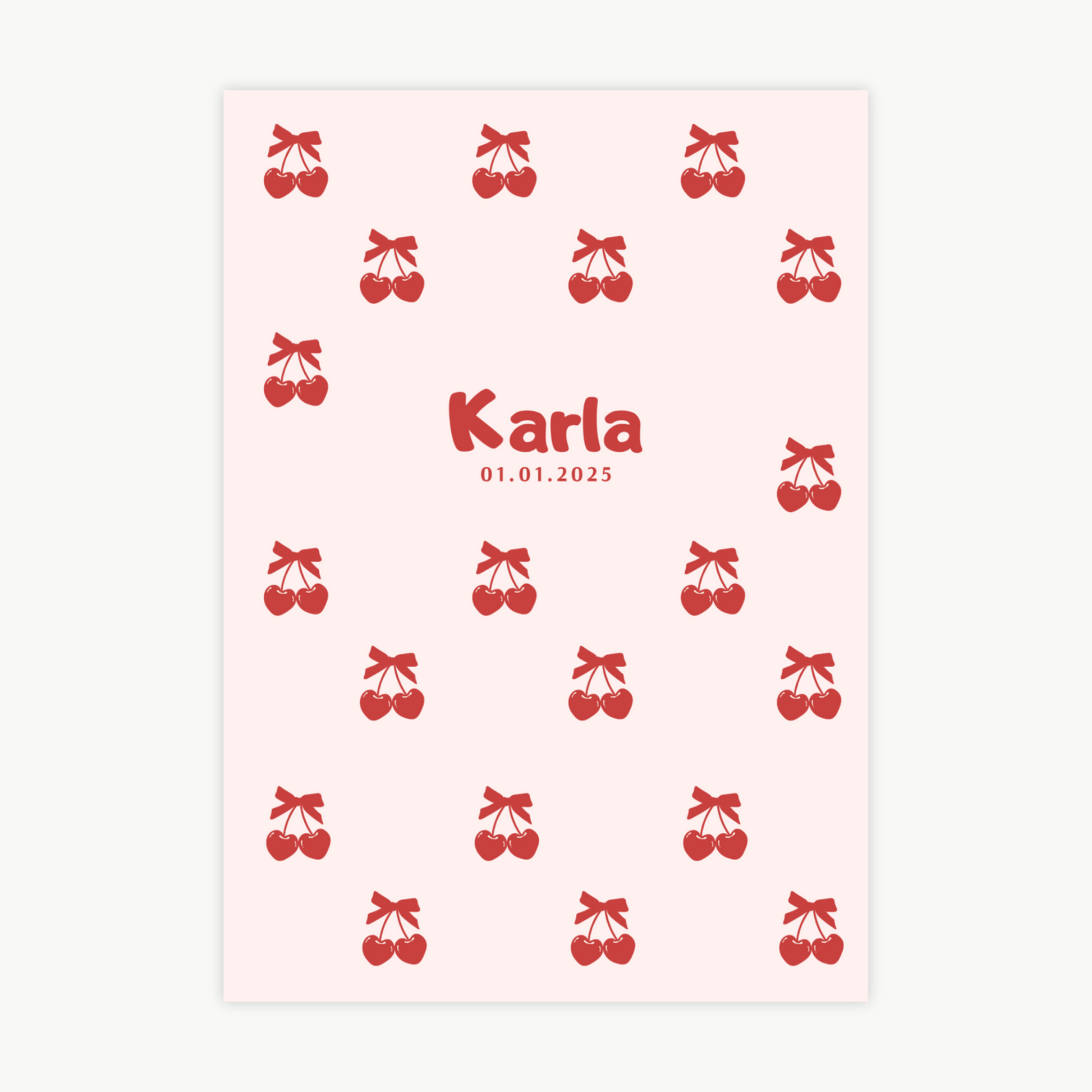 Unsere bunten Kinderposter werden mit viel Liebe gestaltet und können ganz einfach mit dem Namen deines Kindes personalisiert werden – auf Wunsch auch mit Geburtsdatum oder einem kleinen Extra-Detail. Das wunderschöne Kirschen-Motiv, bringen Wärme und Freude ins Kinderzimmer und schaffen eine besondere Wohlfühlatmosphäre.
