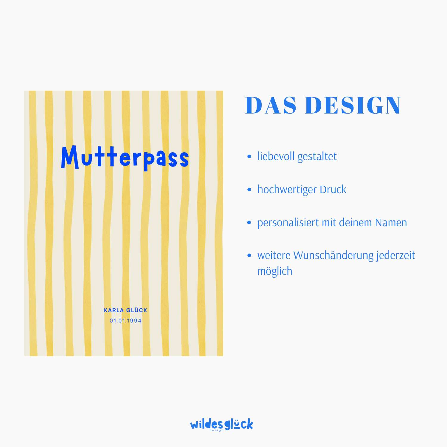 Jede Schwangerschaft ist einzigartig – warum also den Standard-Mutterpasshüllen treu bleiben? Mit dieser hochwertigen und individuellen Mutterpasshülle machst du deinen Mutterpass zu etwas Besonderem. Hier kannst du deinen eigenen Namen und dein Geburtsdatum einfügen lassen. Diese personalisierte Hülle schützt den Mutterpass vor Knicken, Flecken und Abnutzung.